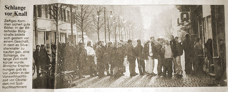 Über unsWir lassen es f�r Sie so richtig krachen. Unsere Firma ist ein kleines Unternehmen, ans�ssig in R�sa/Sachsen-Anhalt, am Rande der D�bener Heide. Wir handeln seit 1997 mit Feuerwerksk�rpern der Kategorien 1 und 2 sowie auch mit Party- und Scherzartikeln. ![]() Unser Silvesterfeuerwerk Verkauf 1998 Zus�tzlich besch�ftigen wir uns seit 2002 mit der Planung und professionellen Durchf�hrung von Feuerwerken aller Art. Unser Team setzt sich zusammen aus: Maik Schöpe - der Firemaster